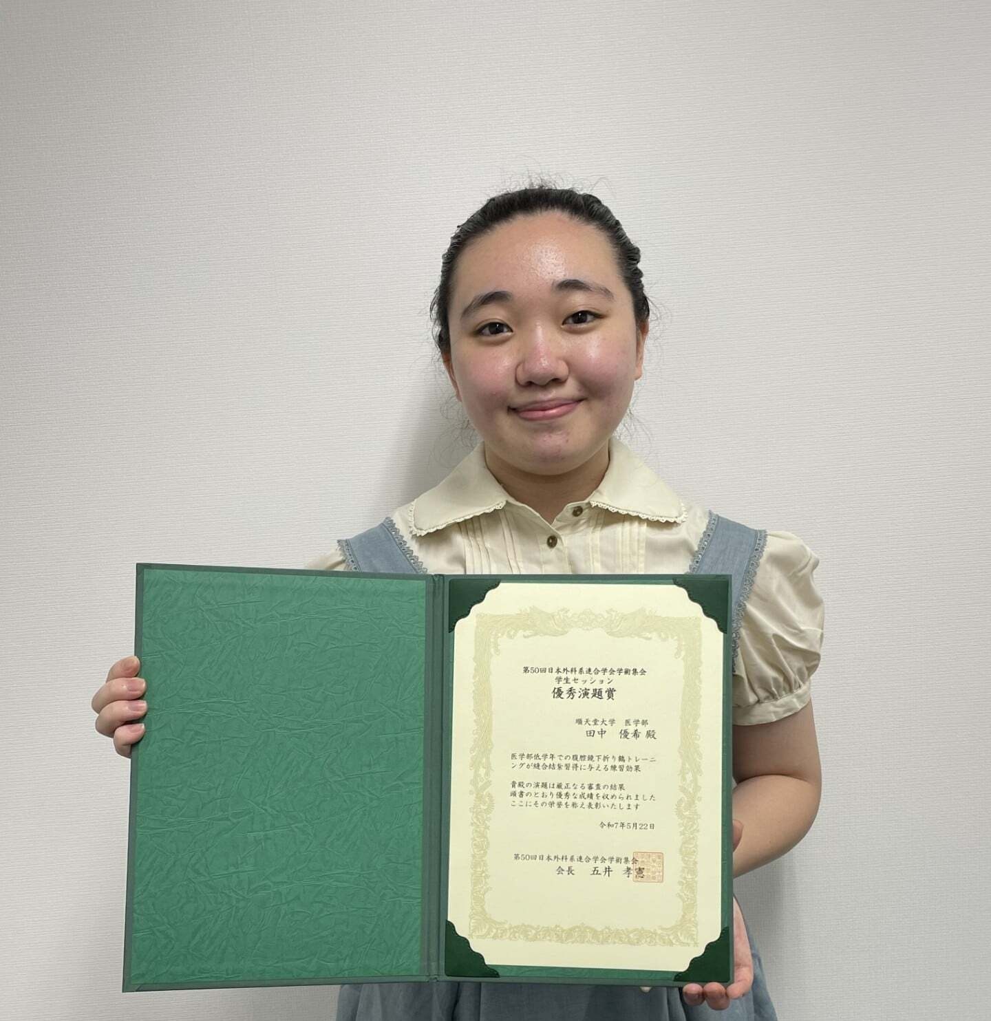 元々は学内にあるシミュレーターで、腹腔鏡の縫合結紮の練習に取り組んだことがキッカケでした。そんな中「SASUKE※1」の存在を知って、その課題項目である縫合結紮技術の向上のため、鉗子の先端で折り鶴を折る手技を集中的にトレーニングするようになりました。その後日、とあるきっかけから「学生セッション※2」への参加を勧められまして、同じトレーニングの成果をまとめて発表したところ、なんと優秀演題賞を受賞したんです。授業や部活動と並行し、準備として本格的なデータ解析を進めていたので、本当に大変でしたが。最高の結果になって、苦労が報われたって感じです。